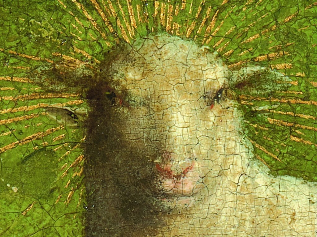 Tijdens de restauratie van Het Lam Gods in 2018 is sprake van een verrassing. Eeuwenlang heeft het lam er door een latere overschildering braaf en wat onnozel uitgezien (eerste afbeelding). Nu die verflaag is verwijderd, blijkt het oorspronkelijke lam een heel andere snuit te hebben.