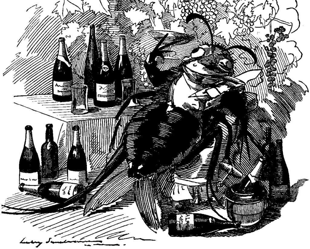De druifluis doet zich te goed aan de beste wijnen, waaronder champagne. Cartoon uit Punch (1890).